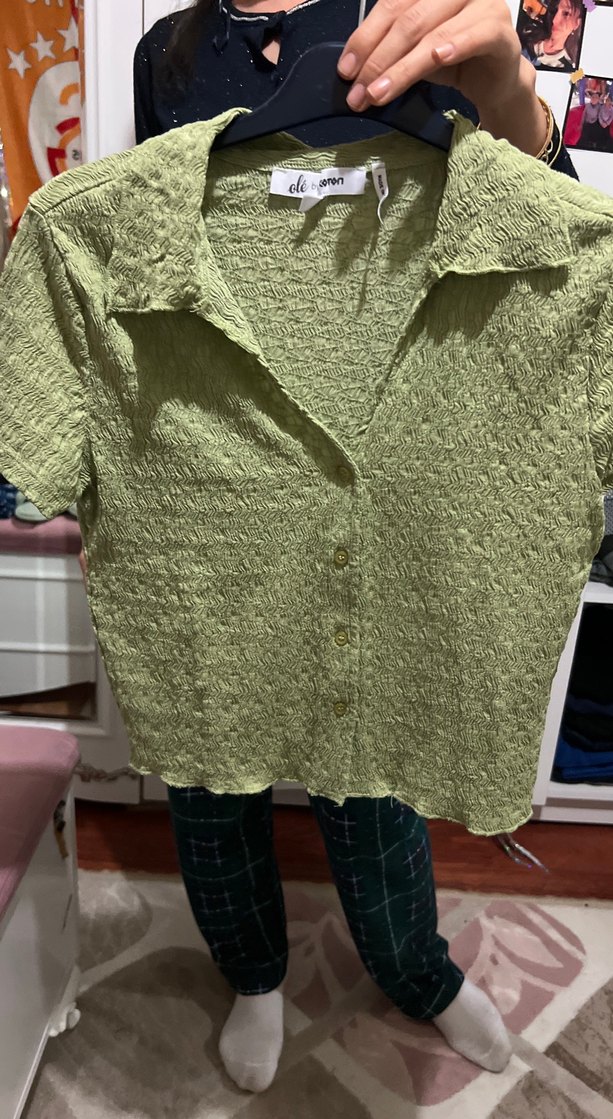 Düğmeli, kısa kollu, yeşil keten gömlek. Notlu yaka ve rahat kesimiyle gündelik sokak tarzına uygun.