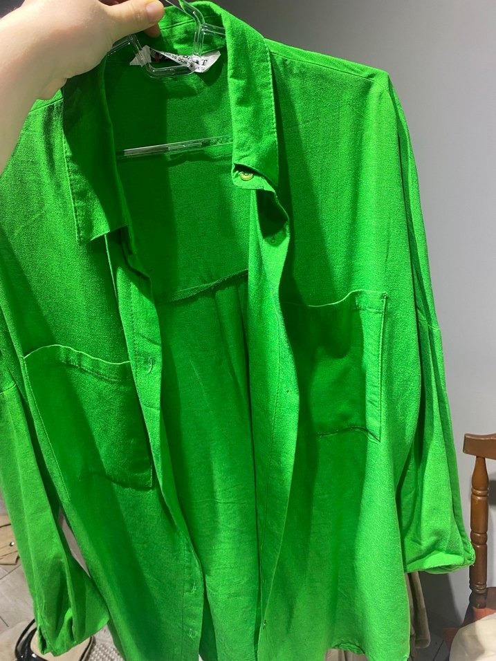 Düğmeli, uzun kollu, yeşil keten kadın gömlek. Salaş kesim ve kesik yakalı, parlak görünümlü, günlük rahat sokak stili için uygun.