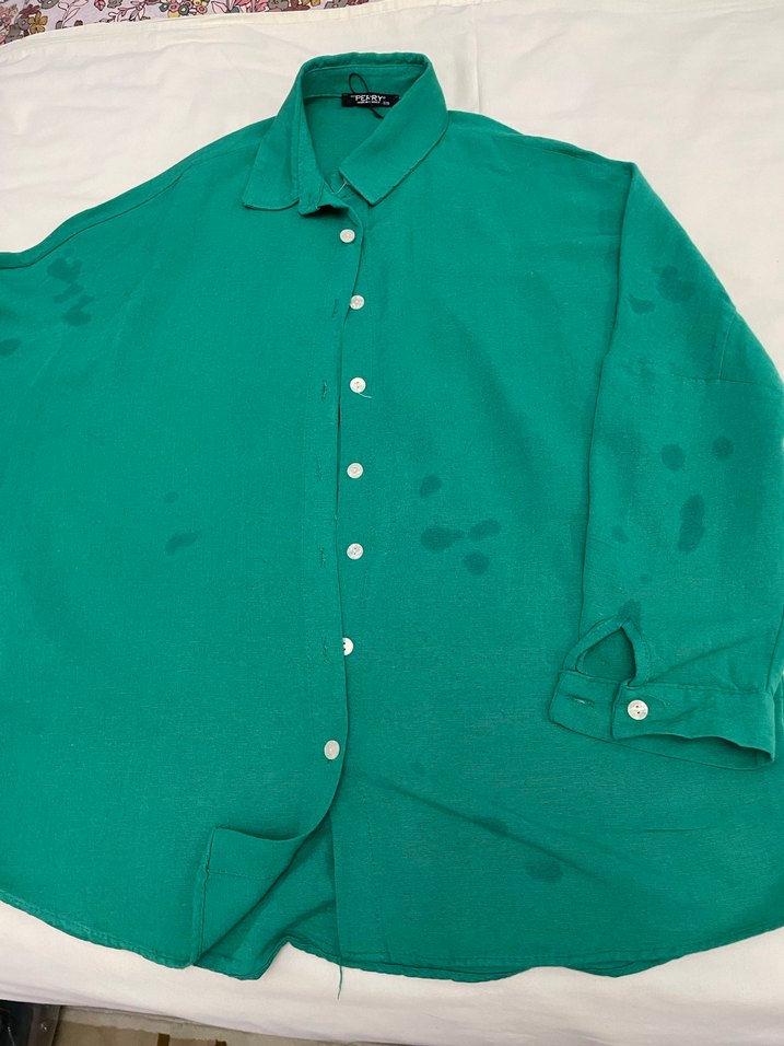 Düğmeli, uzun kollu, yeşil keten kadın gömleği. Salaş kesimi ve yakalı tasarımıyla günlük sokak stiline uygundur. Bir kez giyildi Yeni ütülenmiş halde çekildi lekesi yok