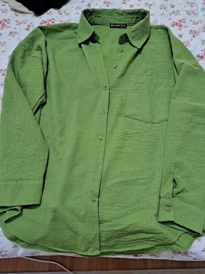 Uzun kollu, düğmeli, yeşil keten kumaştan, göğüs cepli salaş kesim kadın gömlek. Günlük kullanıma uygundur.