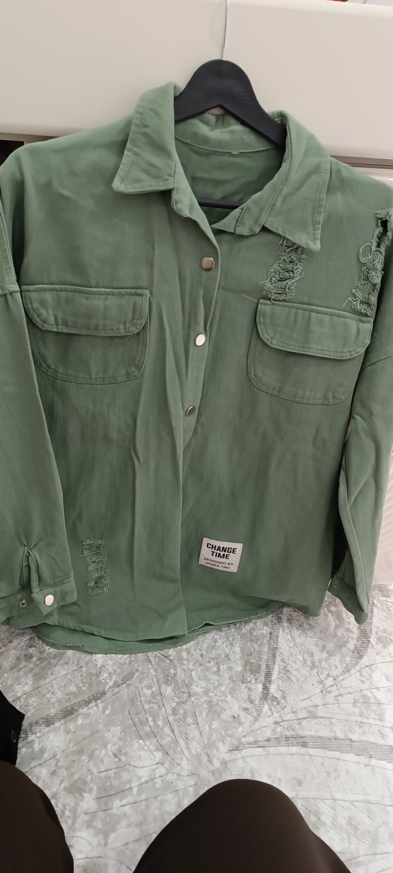 Yeşil keten kumaştan, düğmeli, kısa kesim ve bol kesim kadın gömlek. Notch yaka ve uzun kolludur. Sokak stiline uygun, parlak yeşil tonunda ve desenizdir. Üzerinde "CIANDE" etiketi bulunmaktadır.