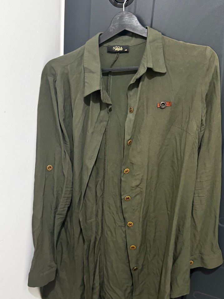 Bu yeşil keten kadın gömlek, düğmeli uzun kollu ve kesimli yaka detayına sahiptir. Salaş kesimli ve midi boyda, günlük rahat kullanım için uygundur.