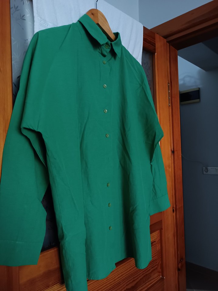 Düğmeli, yakalı ve uzun kollu yeşil keten gömlek. Normal kesim ve midi boyda, günlük rahat sokak stili için uygundur.
