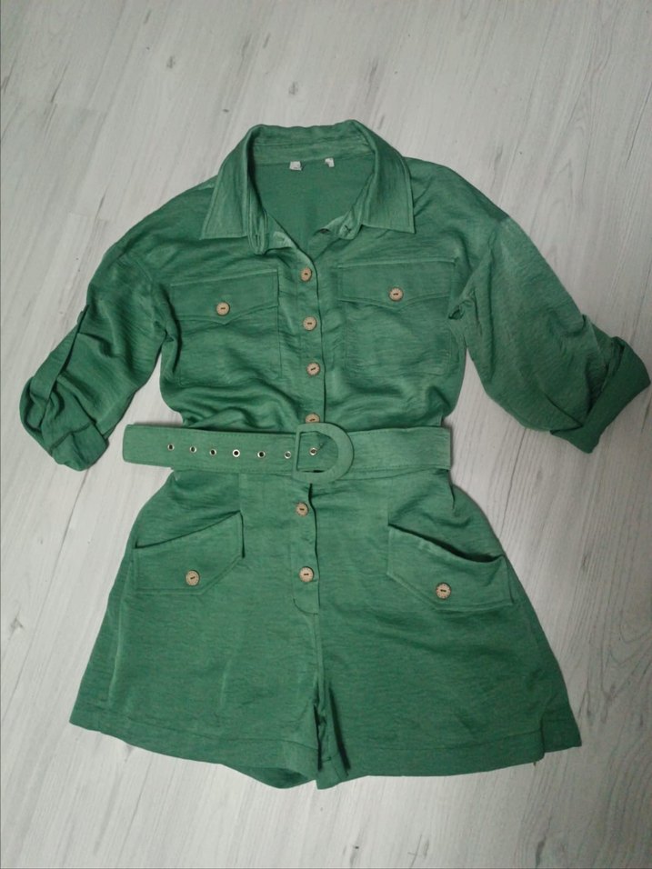 Yeşil keten mini tulum, düğmeli ön, yakalı ve askılı kolludur. Bol kesim ve kemerli, bohem tarzda gündelik kullanıma uygun.