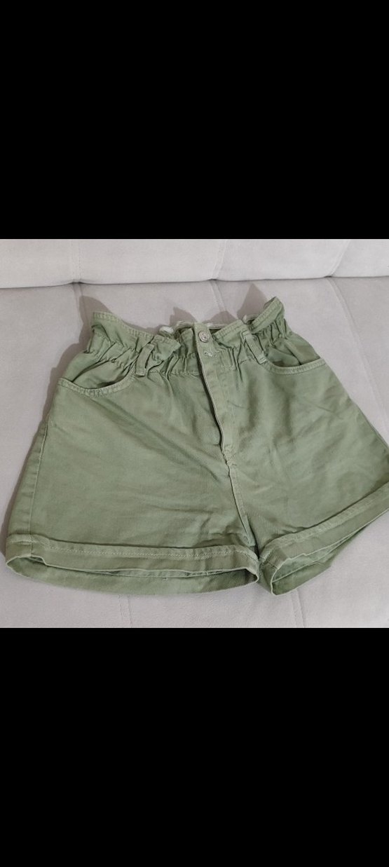 Düğmeli, yüksek bel, pastel yeşil keten kadın şort. Rahat kesimi ve günlük kullanıma uygun sokak stili sunar.
