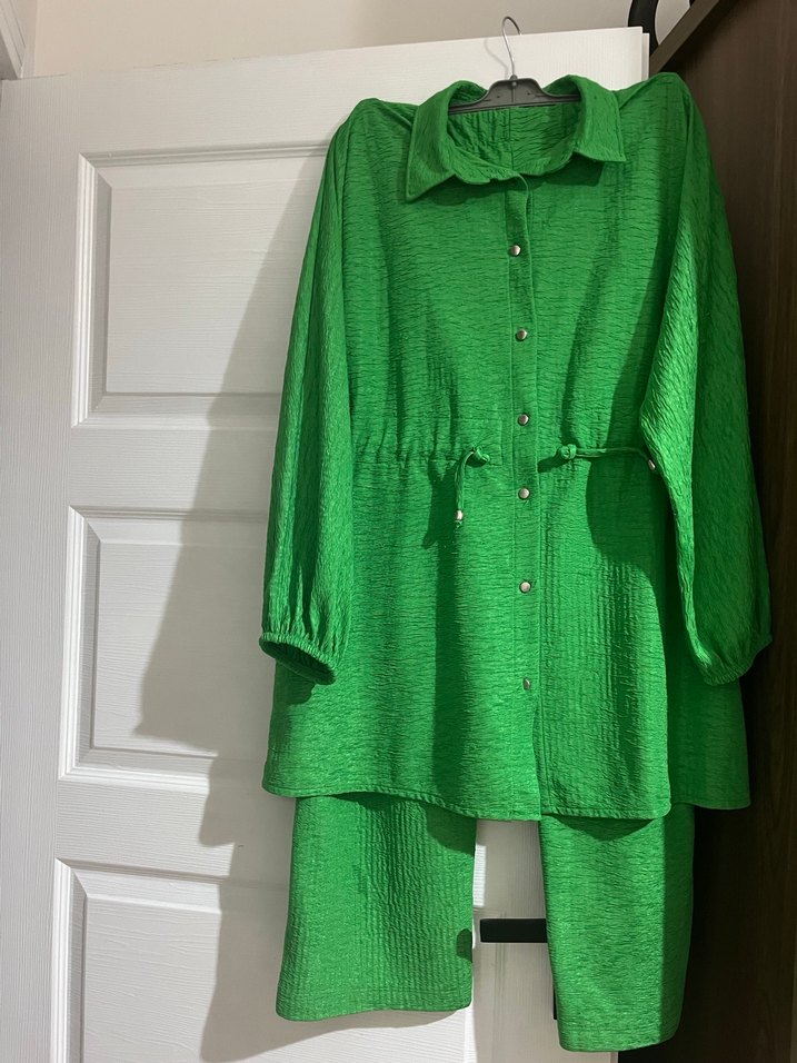 Düğmeli Yeşil Keten Uzun Kadın Takım