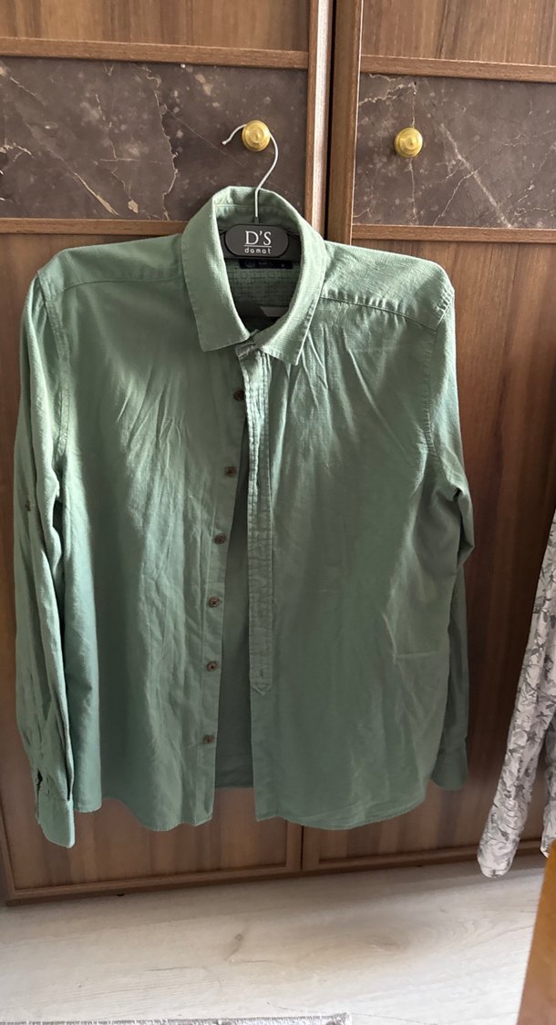 Düğmeli Yeşil Keten Uzun Kollu Erkek Gömlek
