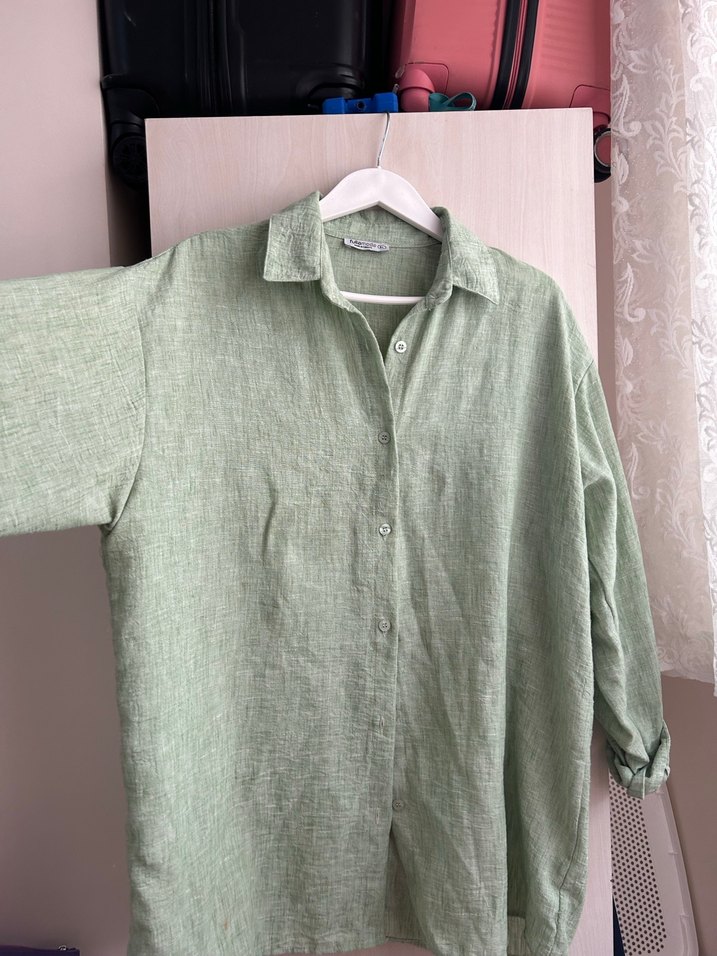 Düğmeli, uzun kollu, yakalı yeşil keten gömlek. Salaş kesimi ve minimalist bohem tarzıyla günlük kullanım için uygundur.