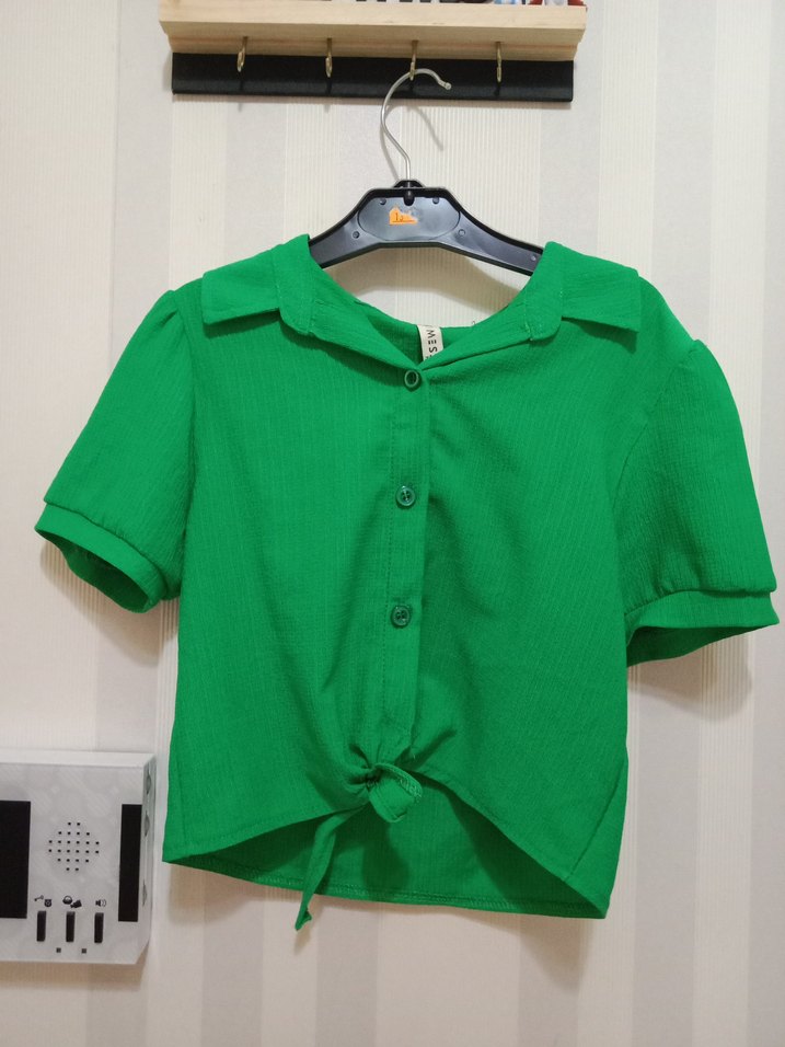 Yeşil renkli kadın gömlek kısa kollu, düğmeli ve yakalıdır. Nefes alan keten kumaştan üretilmiş, bol kesim ve kısa boylu, ön kısmında bağlama detayı vardır.