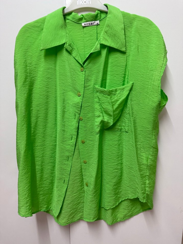 Düğmeli, kısa kollu, yakalı yeşil keten gömlek. Rahat kesimi ve parlak dokusuyla günlük sokak stiline uygun.