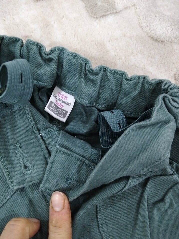 Düğmeli tasarıma sahip yeşil erkek çocuk pantolonu, rahat bol kesim ve düz basic stilde, yumuşak sentetik kumaştan üretilmiştir.