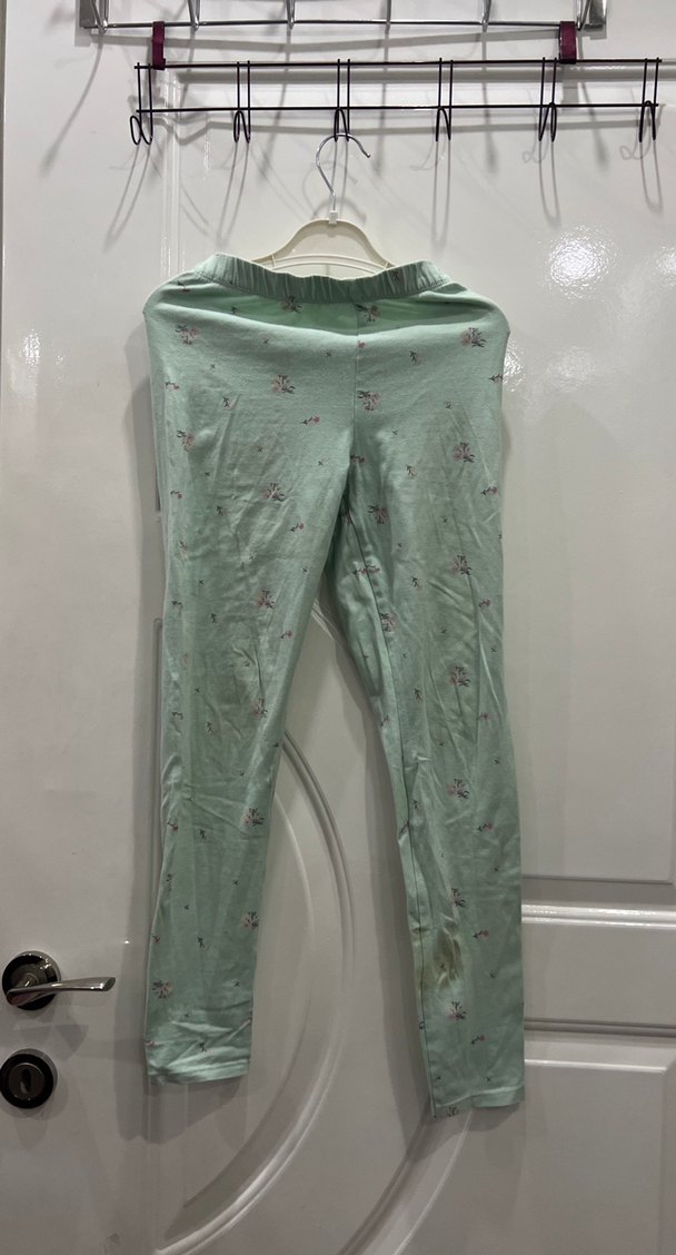 Düğmeli, pastel yeşil renkli, yumuşak sentetik kumaştan yapılmış fit kesim kız tayt.