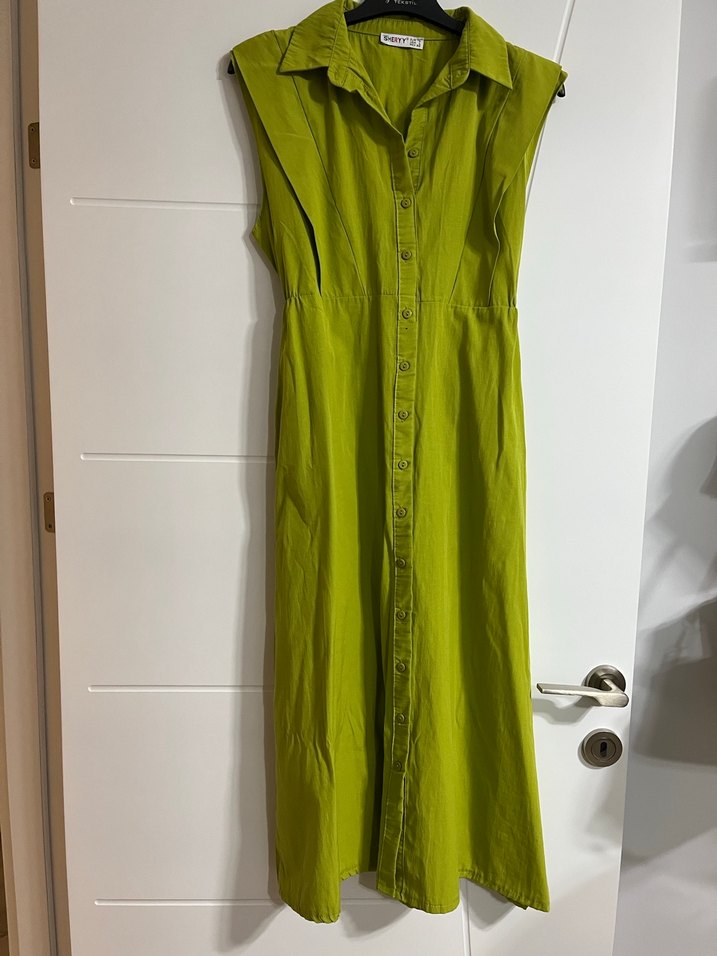 Parlak yeşil keten kumaştan, düğmeli ve kolsuz uzun, bele oturan elbise. Straplez yakalı, sokak stiline uygun.