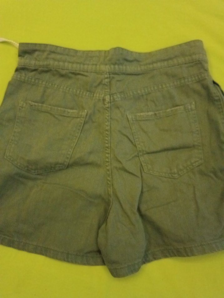 Düğmeli, cep detaylı, yeşil kot kumaştan yapılmış, bol kesim mini şort.