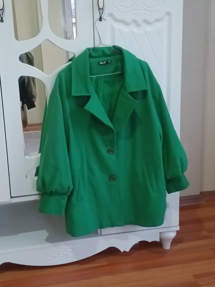 Düğmeli, yeşil midi uzunlukta ceketi. Notlu yaka, uzun kollu ve bol kesim, yumuşak ve sıcak kumaştan üretilmiştir. Günlük kullanıma uygundur.