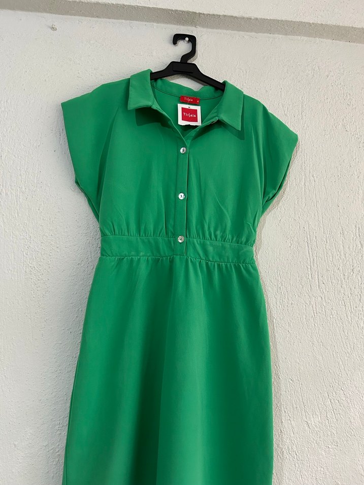 Yeşil midi elbise, kısa kollu, yakalı ve düğmeli ön detaylıdır. Rahat kesimi ve yumuşak, sıcak kumaşıyla gündelik kullanıma uygundur.