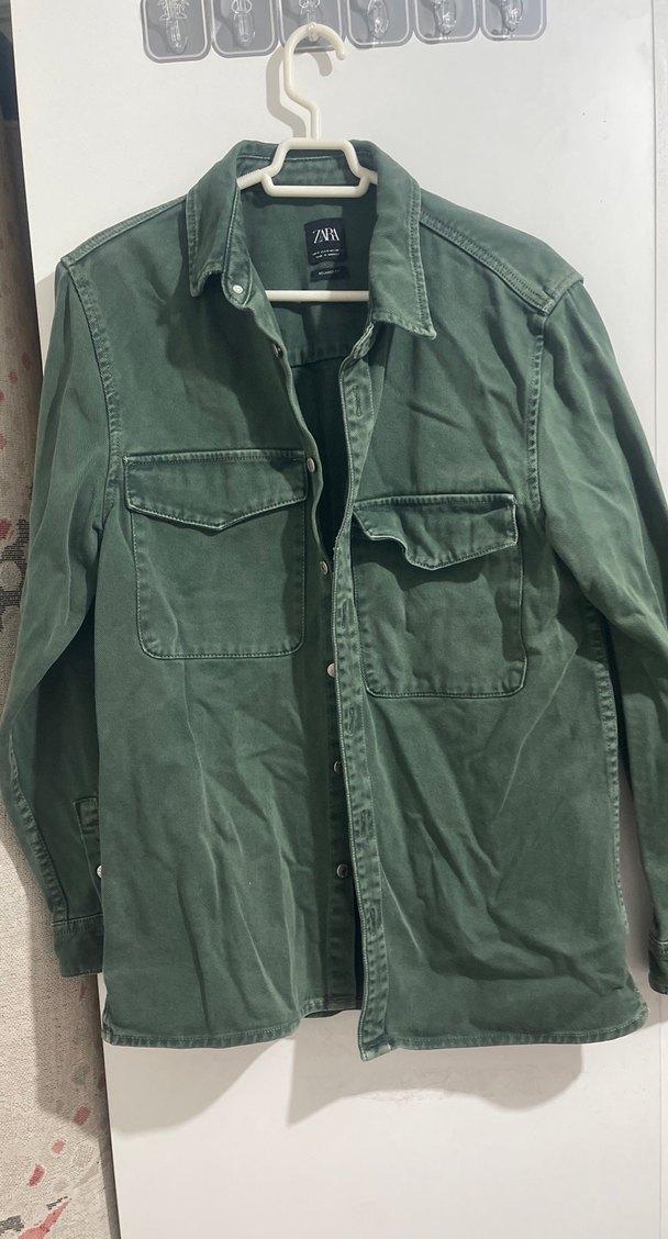Bu yeşil keten ceket, uzun kollu ve düğmeli, cep detaylıdır. Rahat kesimiyle gündelik sokak stiline uygundur.