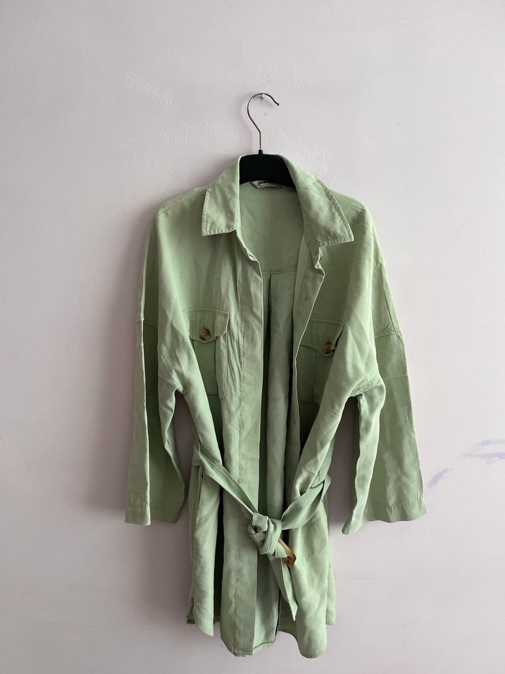 Pastel yeşil pamuk kumaştan, uzun kollu, düğmeli ve kuşaklı, notched lapel yakalı, bol kesim midi gömlek ceket. Minimalist sokak stili için uygundur.