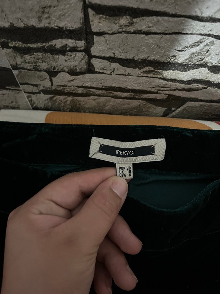 Düğmeli, baskılı desenli, sentetik kumaştan yapılmış yeşil, vücuda oturan midi pantolon. Ofis ve günlük rahat kullanıma uygundur. Marka: İPEKYOL.