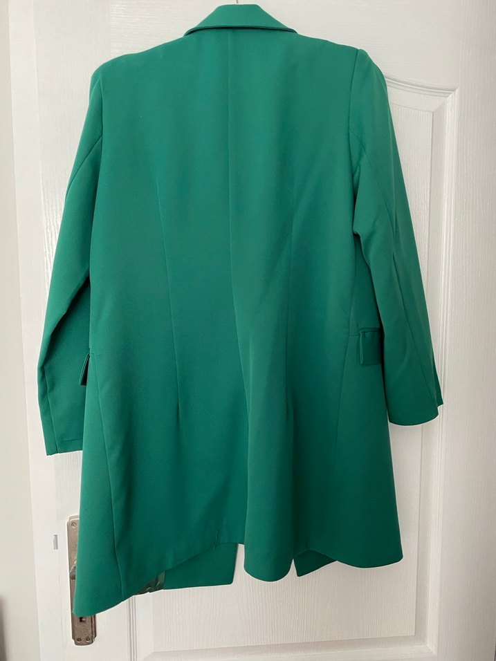 Düğmeli, yeşil renkte midi uzunlukta, regular fit kadın blazer. Notch yaka ve uzun kolludur. Ofis kullanımı için uygundur.
