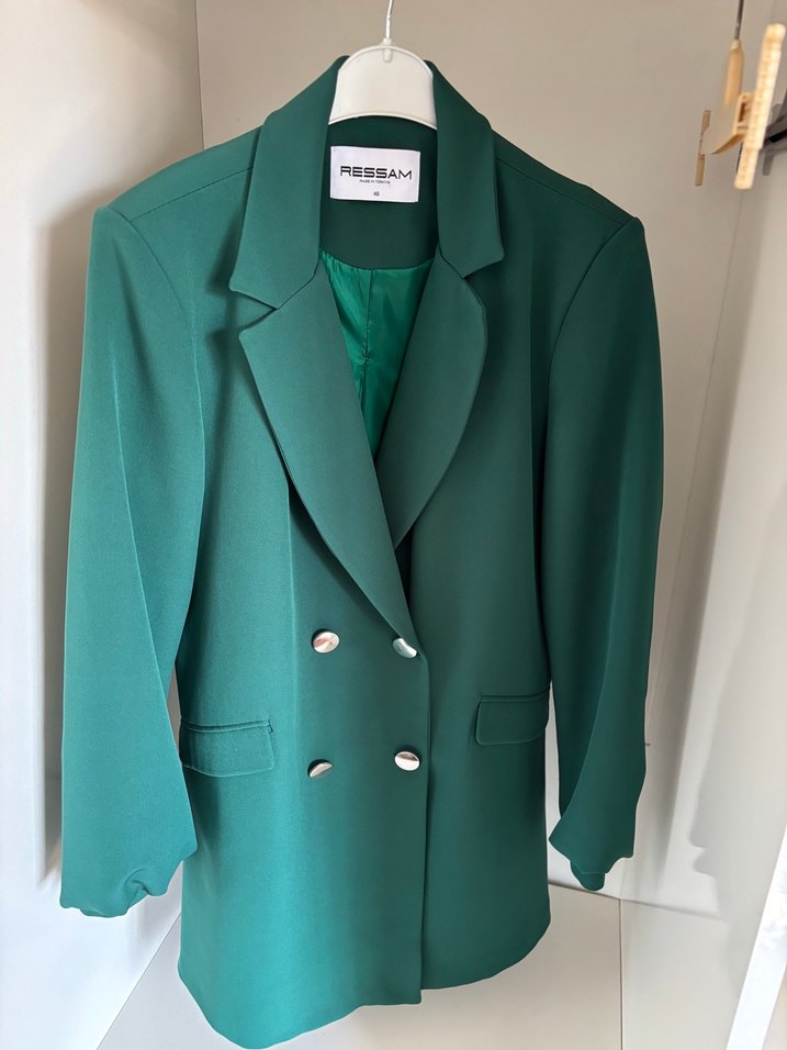 Düğmeli, yeşil midi blazer, parlak sentetik kumaştan, uzun kollu ve normal kesim. Ofis ve günlük kullanıma uygun, RESSAM markalı. Sadece iki defa giydim bir kaç saat renk zümrüt yeşili