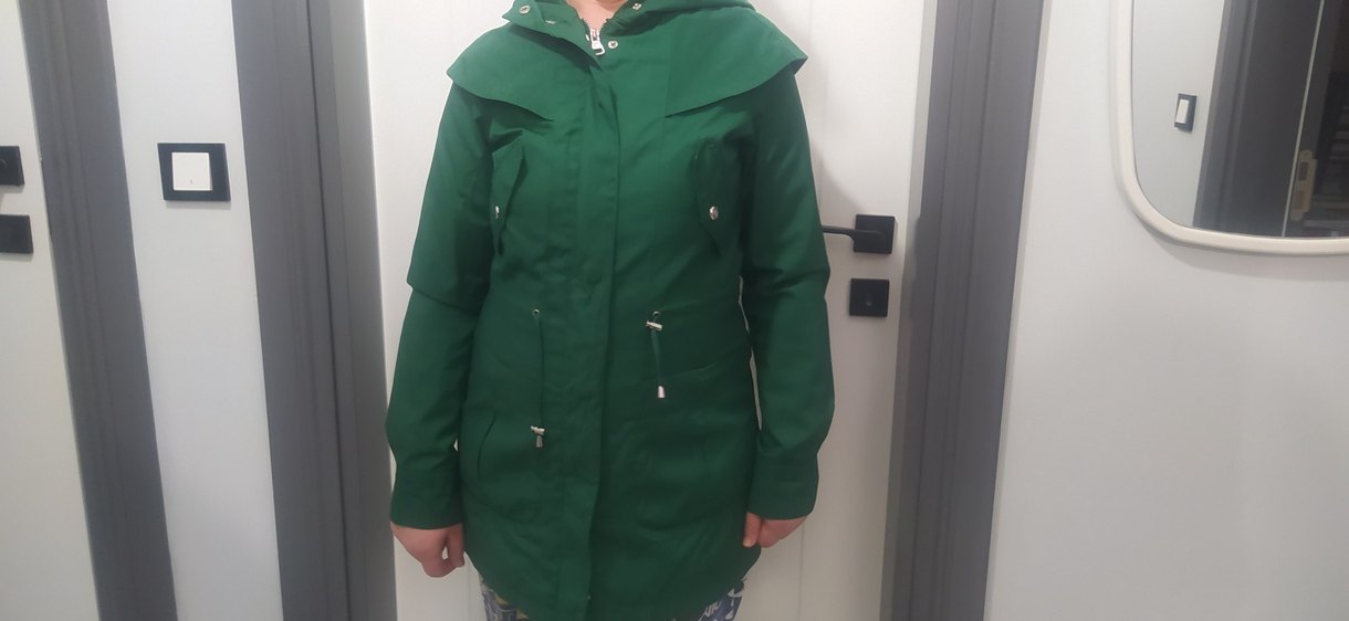 Düğmeli, yeşil midi uzunlukta kadın ceketi. Notlu yakalı, uzun kollu ve parlak sentetik kumaştan, rahat kesim.