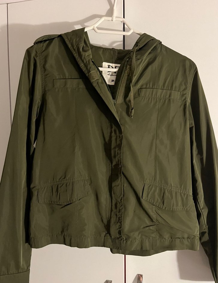 Düğmeli, bol kesim yeşil midi ceket, uzun kollu ve kesik yakalıdır. Parlak sentetik kumaştan, dış mekan için uygundur.