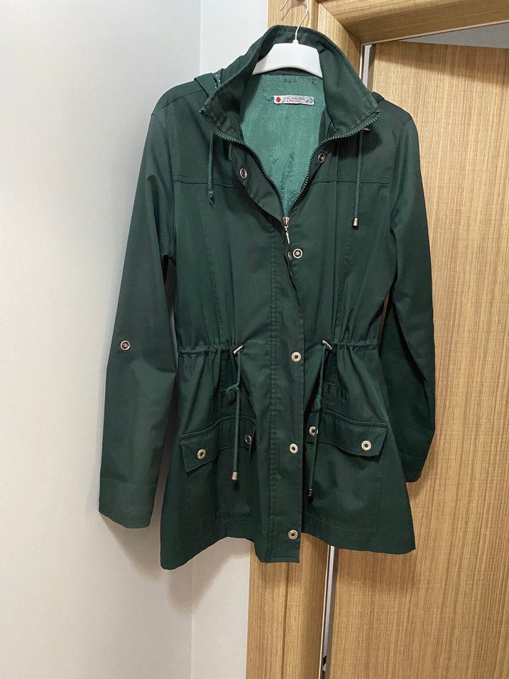 Parlak yeşil renkte, düğmeli ve uzun kollu kadın ceket. Salaş kesimi ve kesik yaka detayıyla günlük sokak stiline uygun midi boyda sentetik kumaştan üretilmiştir.