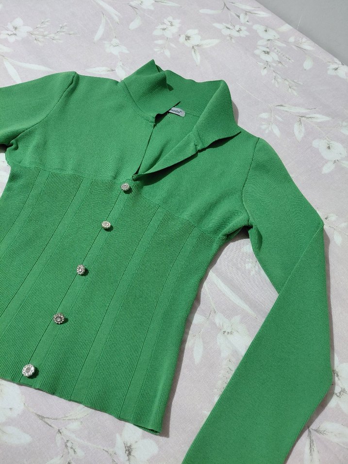 Düğmeli, uzun kollu yeşil kadın ceket, notched lapel yaka ve parlak yüzeye sahip. Sentetik kumaştan, midi boyda, günlük kullanıma uygun, desen içermeyen model.