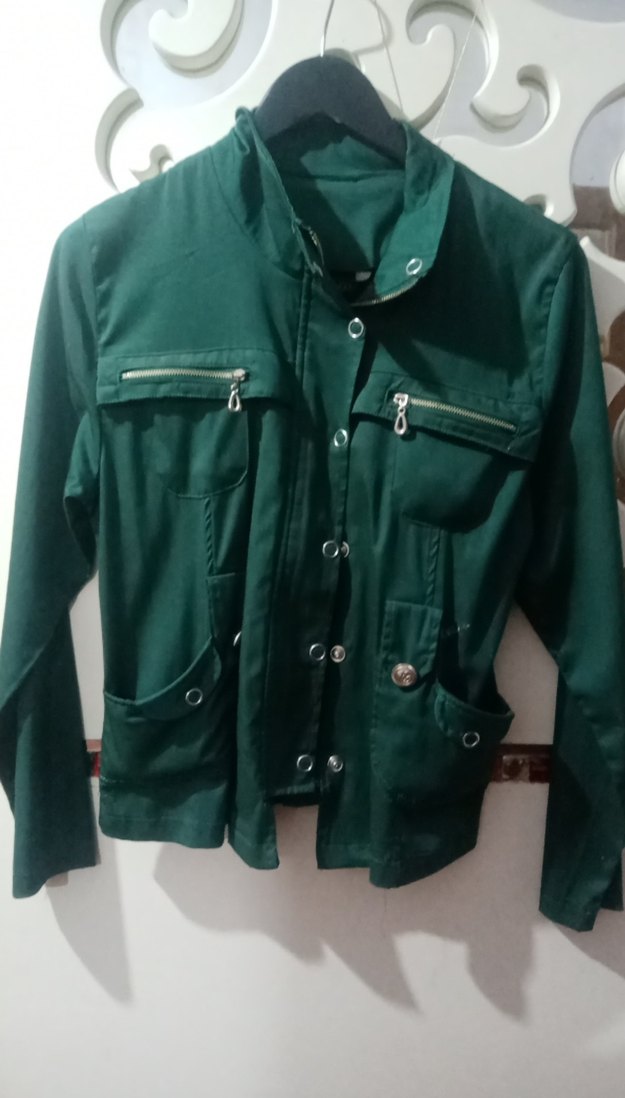 Yeşil renkli, düğmeli, uzun kollu kadın ceket. Normal kesim ve midi boyda, parlak sentetik kumaştan üretilmiştir. Sokak stiline uygun, fermuarlı ceplidir.