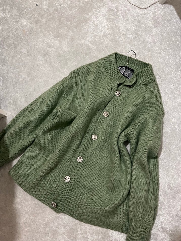 Yeşil yün kumaştan, düğmeli, uzun kollu ve normal uzunlukta, notlu yaka detaylı rahat kesim kadın hırkası.