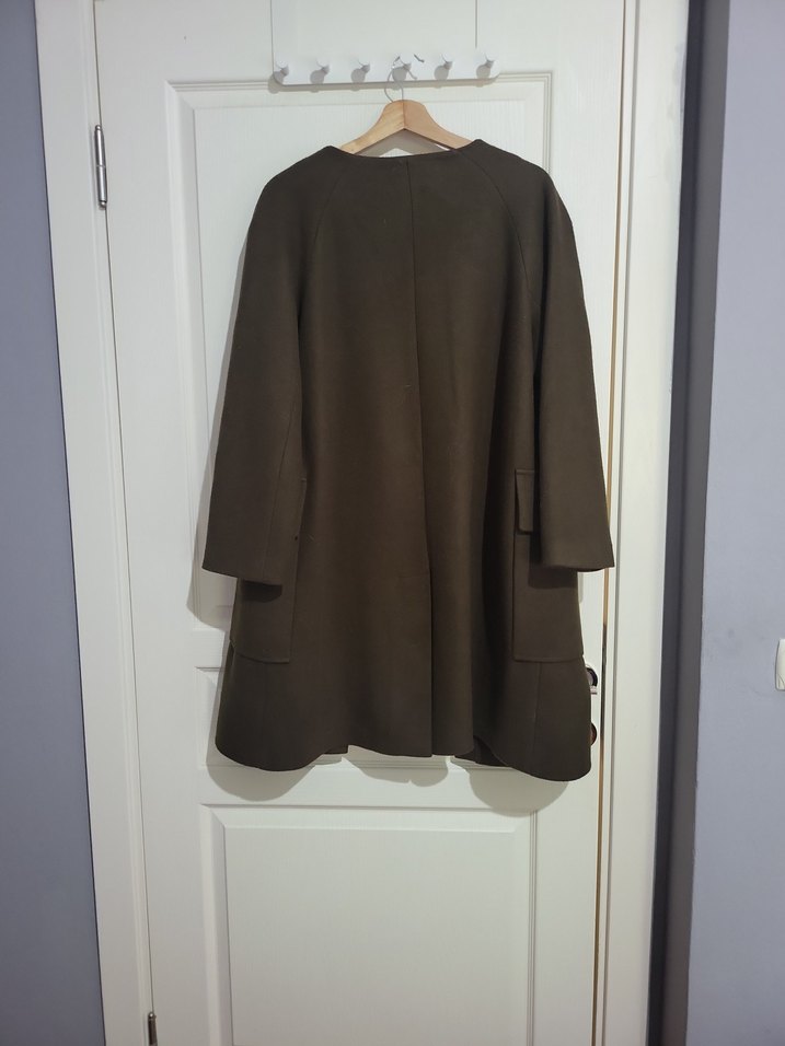 yesil kumaştan, düğmeli, uzun kollu ve yuvarlak yakalı midi uzunlukta, bol kesim kadın kaban. Minimalist ve normcore tarzına uygun, ofis için ideal.