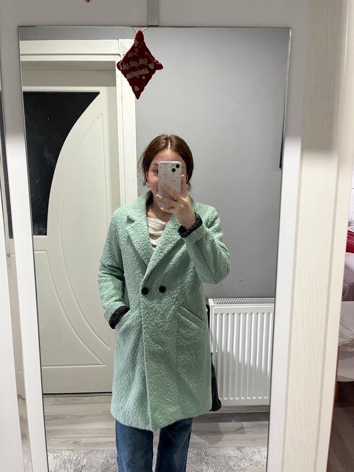 Gevşek kesim, düğmeli, yakalı ve uzun kollu, yumuşak ve sıcak kumaştan yapılmış pastel gri tonunda kadın kabanı. Günlük kullanım için ideal midi boyda.