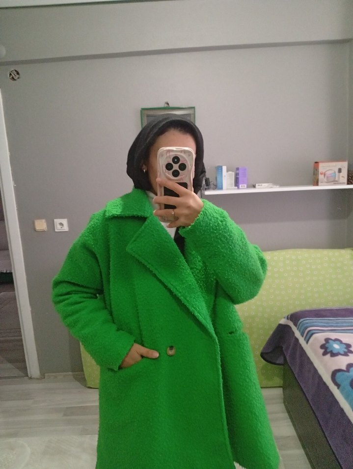 Açık yeşil renkte, düğmeli ve normal uzunlukta midi kadın kaban. Notlu yaka ve uzun kollu, rahat ve yumuşak dokulu kumaştan üretilmiştir.