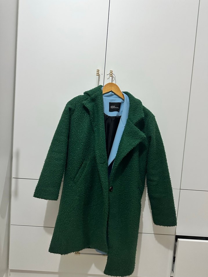 Düğmeli ve yeşil renkte, soft ve sıcak kumaştan midi uzunlukta kadın kaban. Notched yaka ve uzun kolludur, günlük rahat kullanım için uygundur.