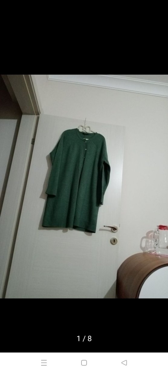 Düğmeli, midi boy, uzun kollu ve bol kesim yeşil kadın kabanı. Gri tonlu yeşil renkte, yumuşak ve sıcak dokulu kumaştan üretilmiştir. hırka invee