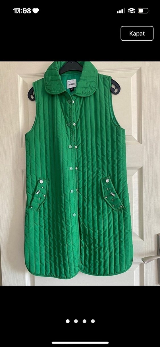 Düğmeli, yakalı, yeşil midi yelek. Normal kesim, parlak ve desensiz tasarıma sahip, günlük kullanıma uygundur.