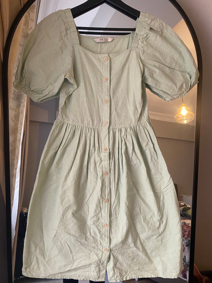 Yeşil renkte keten kumaştan, düğmeli ve kısa kabarık kollu midi elbise. Boğaz kesimli, bol kesim vintage bohem tarzında, romantik akşamlar için uygun.