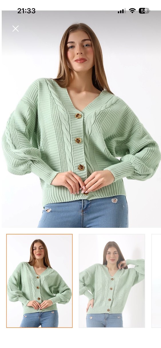 Düğmeli, uzun kollu ve midi boyda yeşil örgü hırka. Salaş kesimi ve yuvarlak yaka detayıyla günlük kullanıma uygundur.