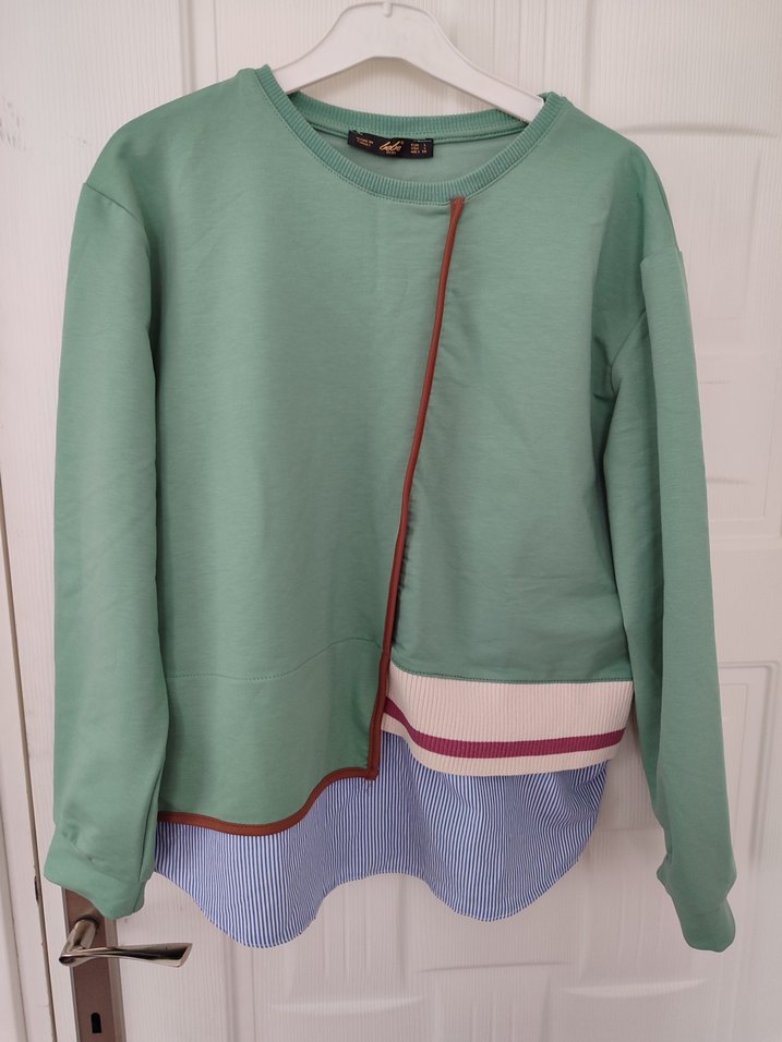 Uzun kollu, yuvarlak yakalı, düğme detaylı ve katmanlı etek ucu olan yeşil bol kesim sweatshirt. Günlük kullanıma uygundur.