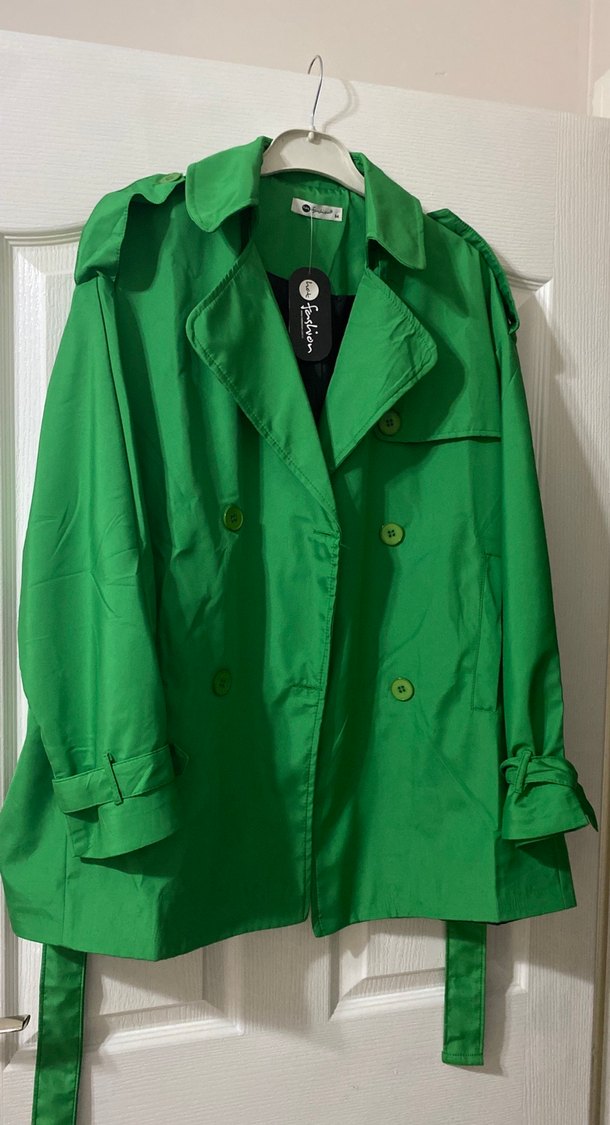 Parlak yeşil renkli, düğmeli, uzun kollu, notched yaka midi uzunlukta bol kesim trençkot. Sokak stili ve günlük kullanım için uygun.