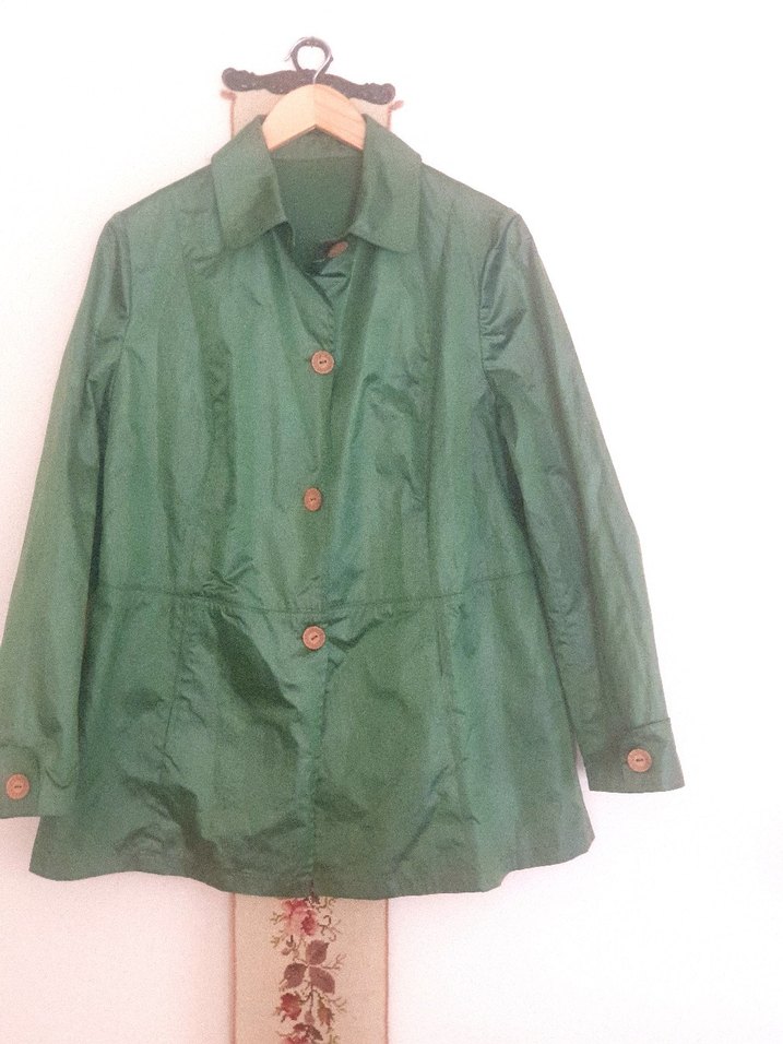 Düğmeli, yeşil, saten dokulu midi uzunlukta, uzun kollu, geniş kesim kadın yağmurluk. Minimalist sokak stili için uygundur. ☔en52 cm boy 75cm
