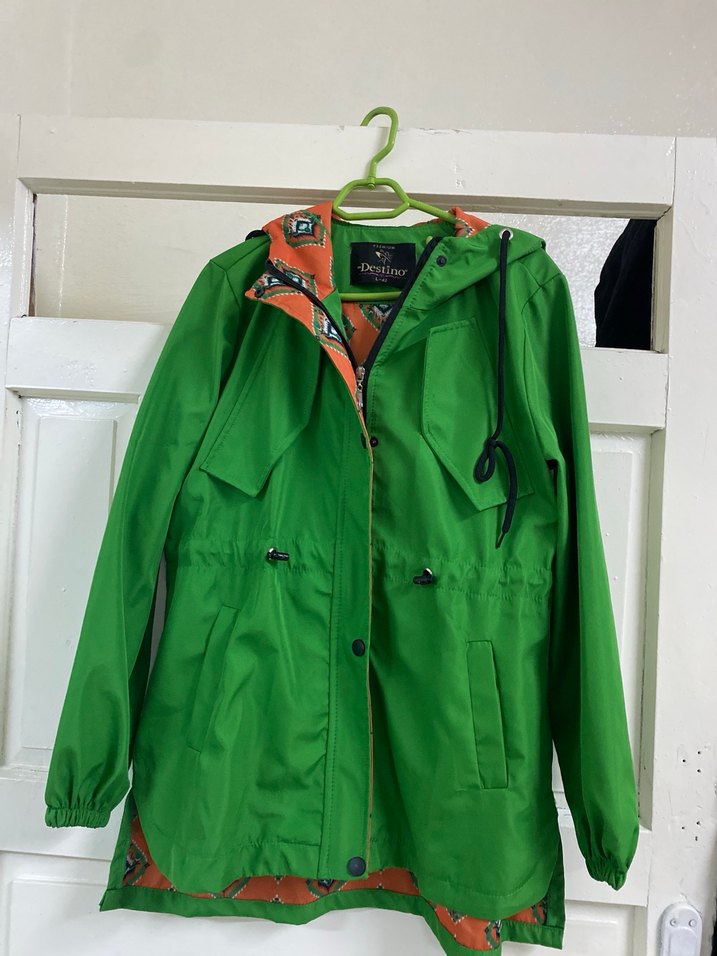 Düğmeli, yeşil renkte, bol kesim midi yağmurluk. Notlu yakalı, uzun kollu ve renkli baskılı astarlı, günlük sokak tarzına uygun. ️