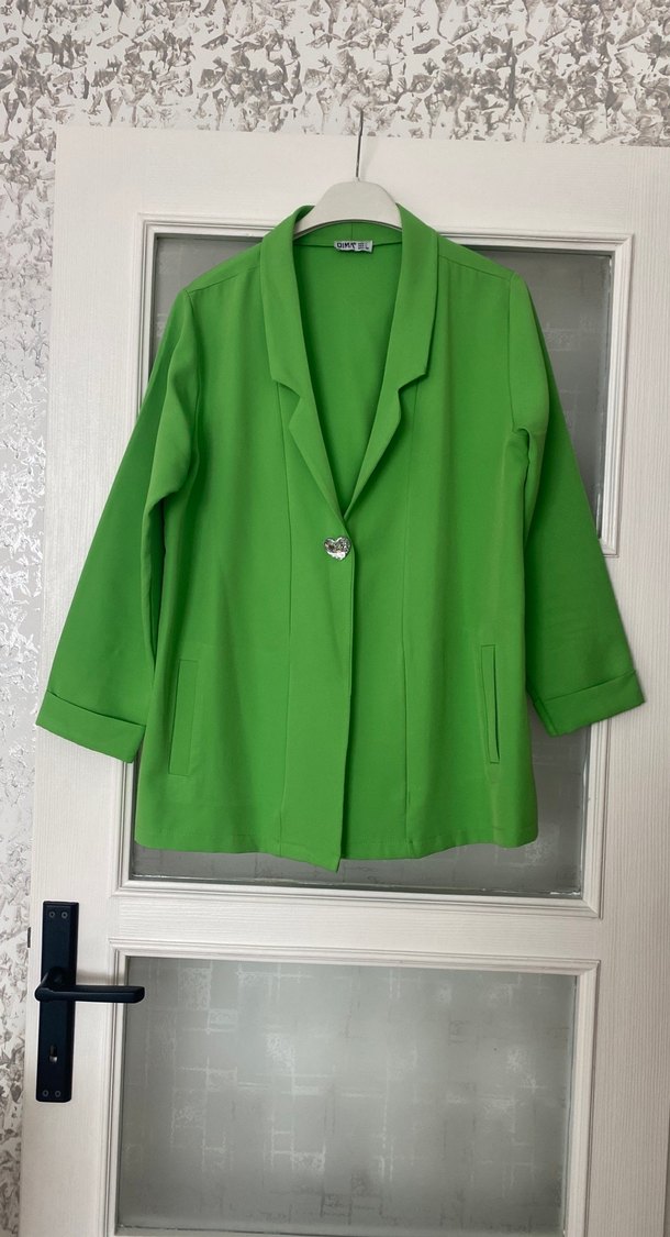 Yeşil renkli, düğmeli kadın blazer. Notlu yaka, uzun kollu ve mini kısa kesim. Yumuşak ve sıcak dokulu kumaştan, parlak yüzeyli, iş ortamına uygun.