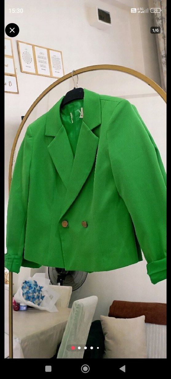 Parlak yeşil kadının düğmeli mini blazerı, kesik yaka ve uzun kollu. Regular fit ve kısa boylu, ipeksi kumaşla ofis için uygun, klasik ve avant-garde tarzda. 40 bedendir sadece bir kere kullanıldı