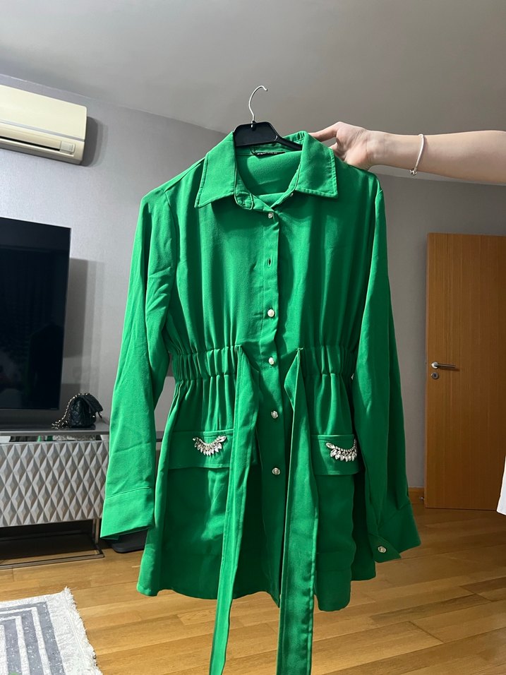 42 beden ama kalibi dar 38/40 olur Parlak yeşil renkte, uzun kollu, düğmeli ve yakalı kısa kadın gömleği. Yumuşak kumlu krep kumaştan, bol kesim ve belden büzgülü, cepleri süslüdür.