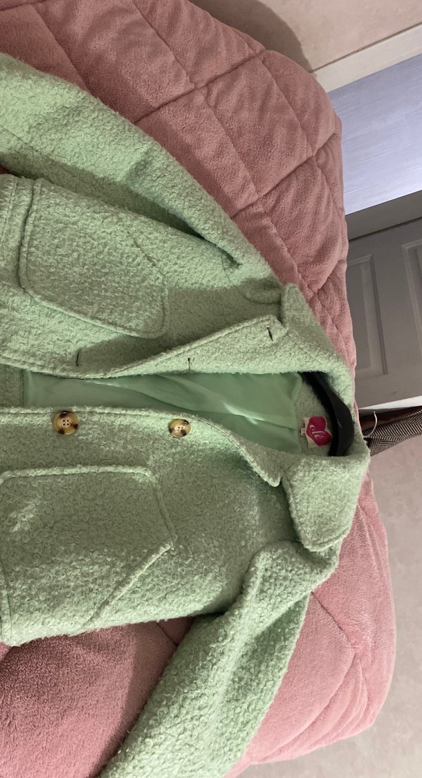 Pastel yeşil renkli, düğmeli ve kısa kesim kadın kaban. Yumuşak, sıcak kumaştan, uzun kollu ve keskin yaka detaylıdır. Rahat sokak stiline uygun.