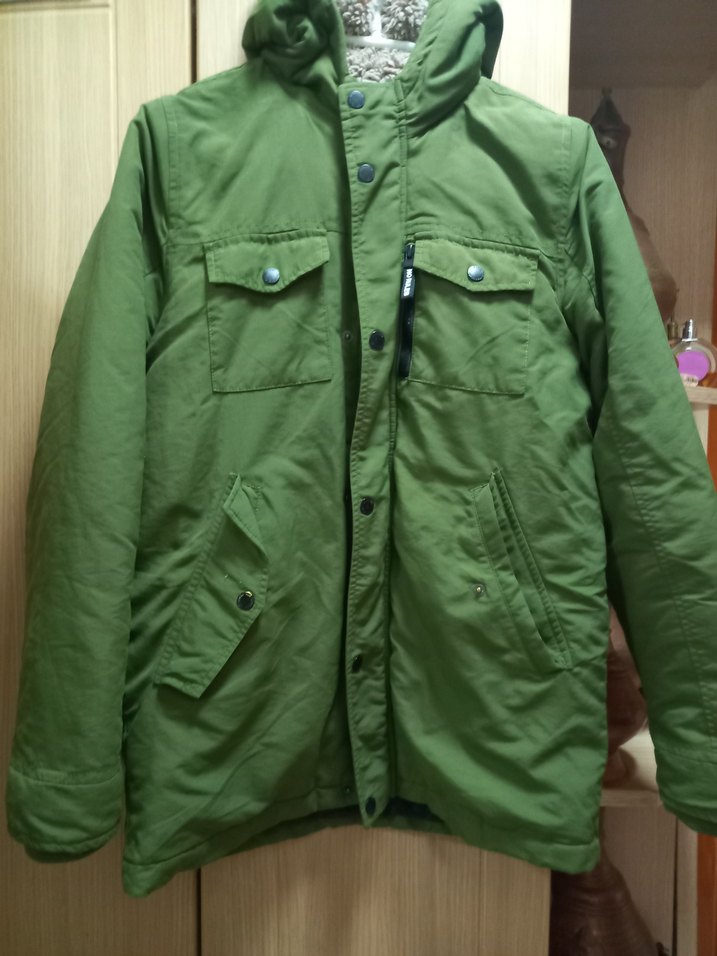 Düğmeli ve çıtçıtlı önü, notched yakalı yeşil mont . Gevşek kesim, uzun kollu ve parlak görünümlü, sokak stiline uygun. Sentetik kumaştan, çok cepli, günlük rahat kullanım için uygun. 13 14 yaş 162 santim Rengi biraz daha koyu O fotoğrafta açık çıkmış