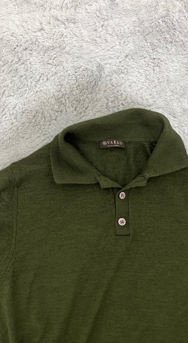 Düğmeli yakalı, kısa kollu yeşil erkek polo tişört. Yumuşak yün kumaştan, günlük sokak stili için uygun, düz ve normal kesim. "OYAKKO" etiketi bulunur.