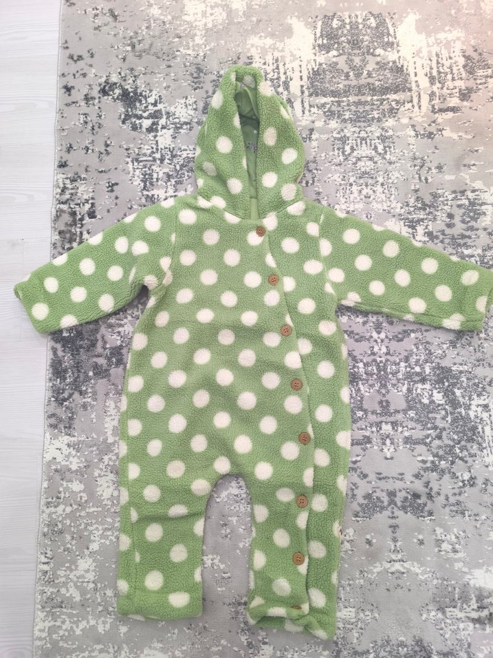 Düğmeli, kapüşonlu bebek tulumu, yeşil renkli ve puantiyeli desenlidir. Yumuşak ve sıcak kumaştan üretilmiş, sokak stili için uygundur. ❄️